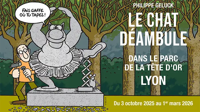 A partir du 3 octobre, le chat déambule au parc de la Tête d’Or. 15 statues en bronze du Chat de Philippe Geluck seront exposées dans l’allée partant de la porte des Enfants du Rhône et menant à la roseraie jusqu’au 1er mars 2026.